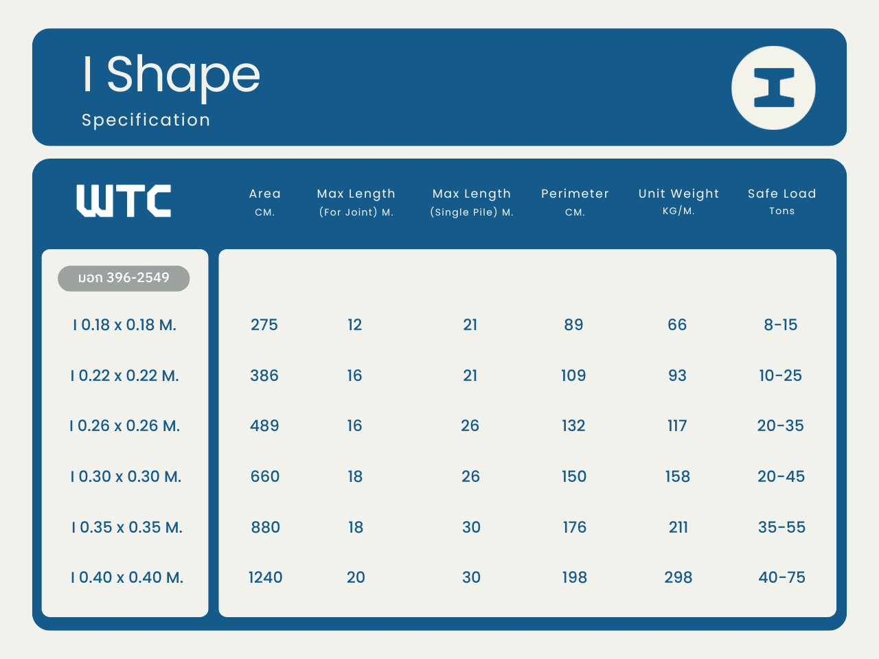 เสาเข็ม WTC รูปตัวไอ เสาเข็มลักษณะนี้จะมีน้ำหนักเบา รองรับน้ำหนักได้เยอะ และมีความทนทาน ด้วยความแข็งแรงของเสาเข็มชนิดนี้จึงนิยมนำมาใช้รองรับน้ำหนักของตัวบ้านเรือนและอาคาร