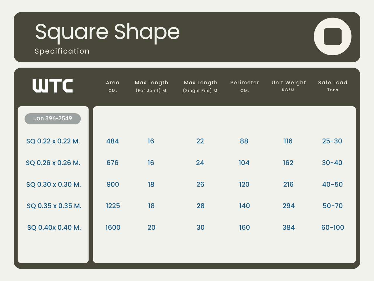 เสาเข็ม WTC รูปสี่เหลี่ยม เป็นเสาเข็มที่มีความทนทานเป็นพิเศษ สามารถรองรับน้ำหนักได้เยอะ มีให้เลือกใช้งานตามขนาดหน้าตัด และความยาวตามที่ต้องการ เหมาะสำหรับการสร้างบ้านเรือน อาคาร โรงงาน งานสะพาน และ งานรากฐานขนาดกลาง ไปจนถึง งานก่อสร้างขนาดใหญ่ เป็นต้น